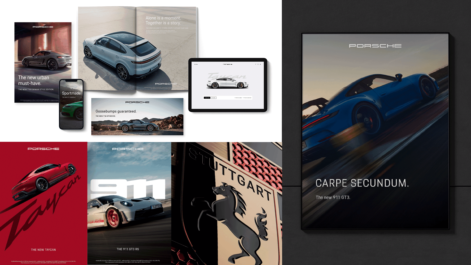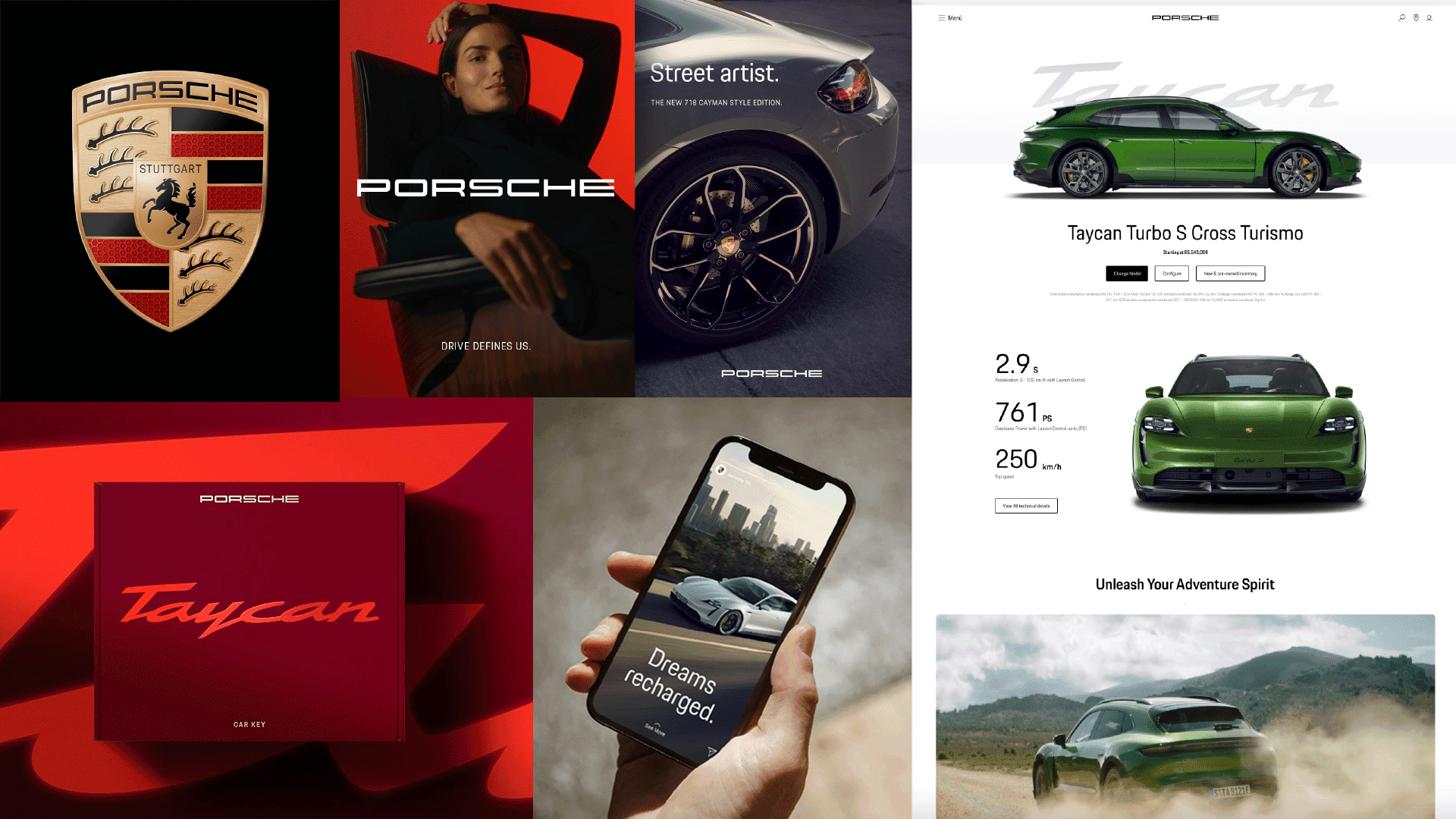 The new layout system follows simple rules that allow a high degree of flexibility in design expression. We use this system to implement the design principles across all media. The iconic wordmark, calm and precise typography, expressive imagery, and model lettering – they work together to create the unmistakable, luxurious Porsche look.